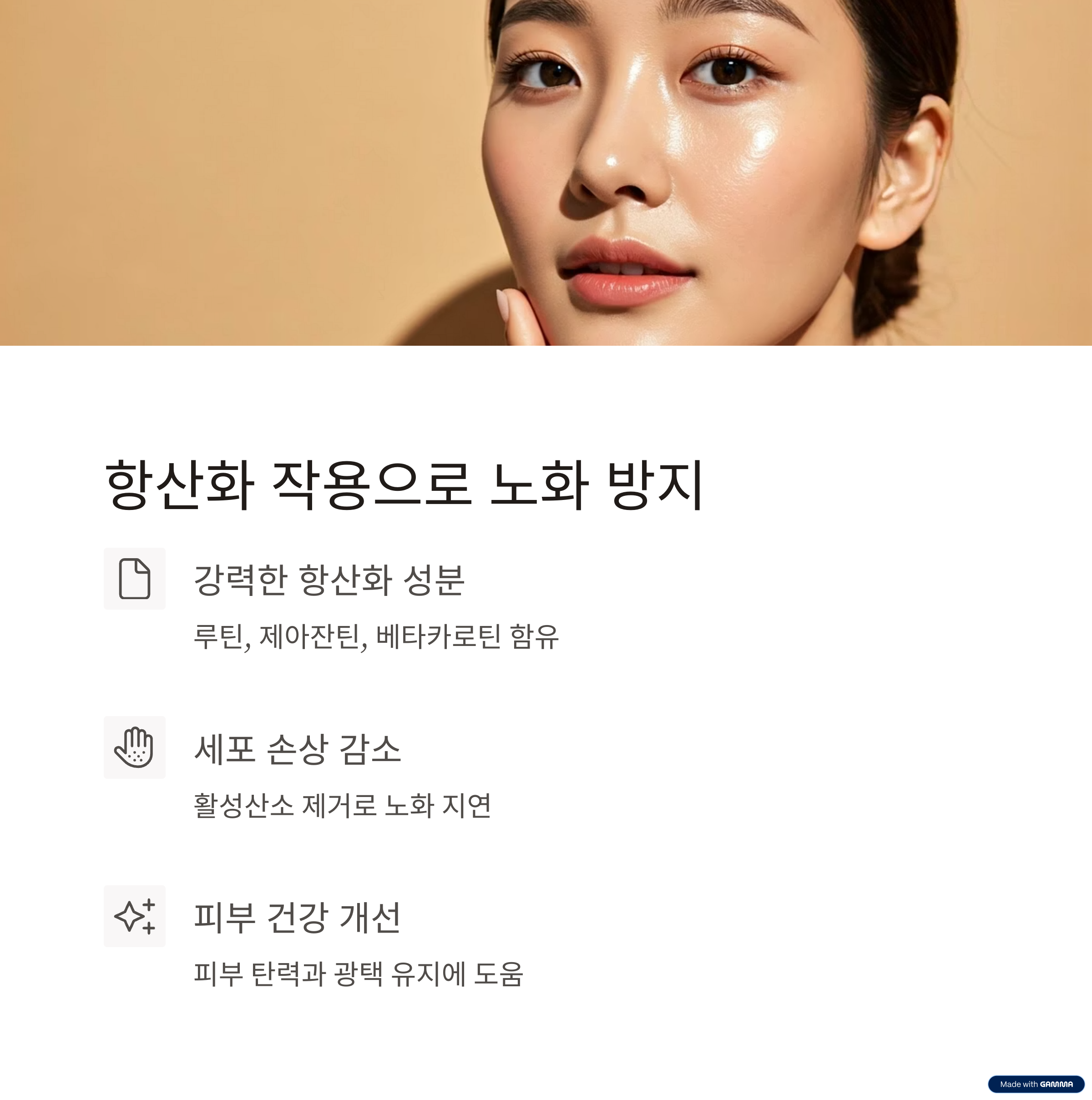 이 성분들은 활성산소를 제거하여 세포 손상을 줄이고 노화를 늦추는 데 도움을 줍니다.