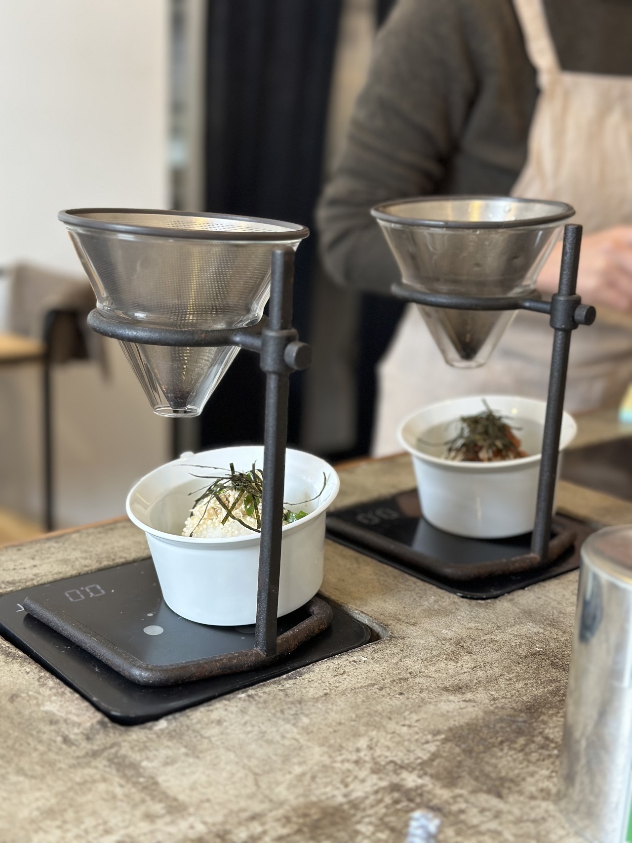그리고 나온 '오차즈케'. 사진에서 보듯이 처음에 필터와 저울이 있길래 '핸드드립 커피를 내려주는가 보다' 생각했다. 근데 밑에 밥, 고명이 담긴 접시를 놓고 필터엔 찻잎을 넣었다. 그리곤 필터에 뜨거운 물을 부어 차를 우려내어 오차즈케를 만들어 주었다. 너무나 신선했고 생소한 경험이었다. 다른 전통적인 방법이 있을 것이라 생각했는데 마치 커피를 내리듯 음식을 만들어 내는 모습이 내겐 신선한 충격으로 다가왔다. 우리가 주문한 오차즈케는 고등어를 조리해 다져 올린 오차즈케 그위엔 토비코 '날치알'처럼 보이는 생선알, 김, 파로 마무리를 했다. 다음에 가면 저 생선알이 무슨 알인지 물어봐야겠다.