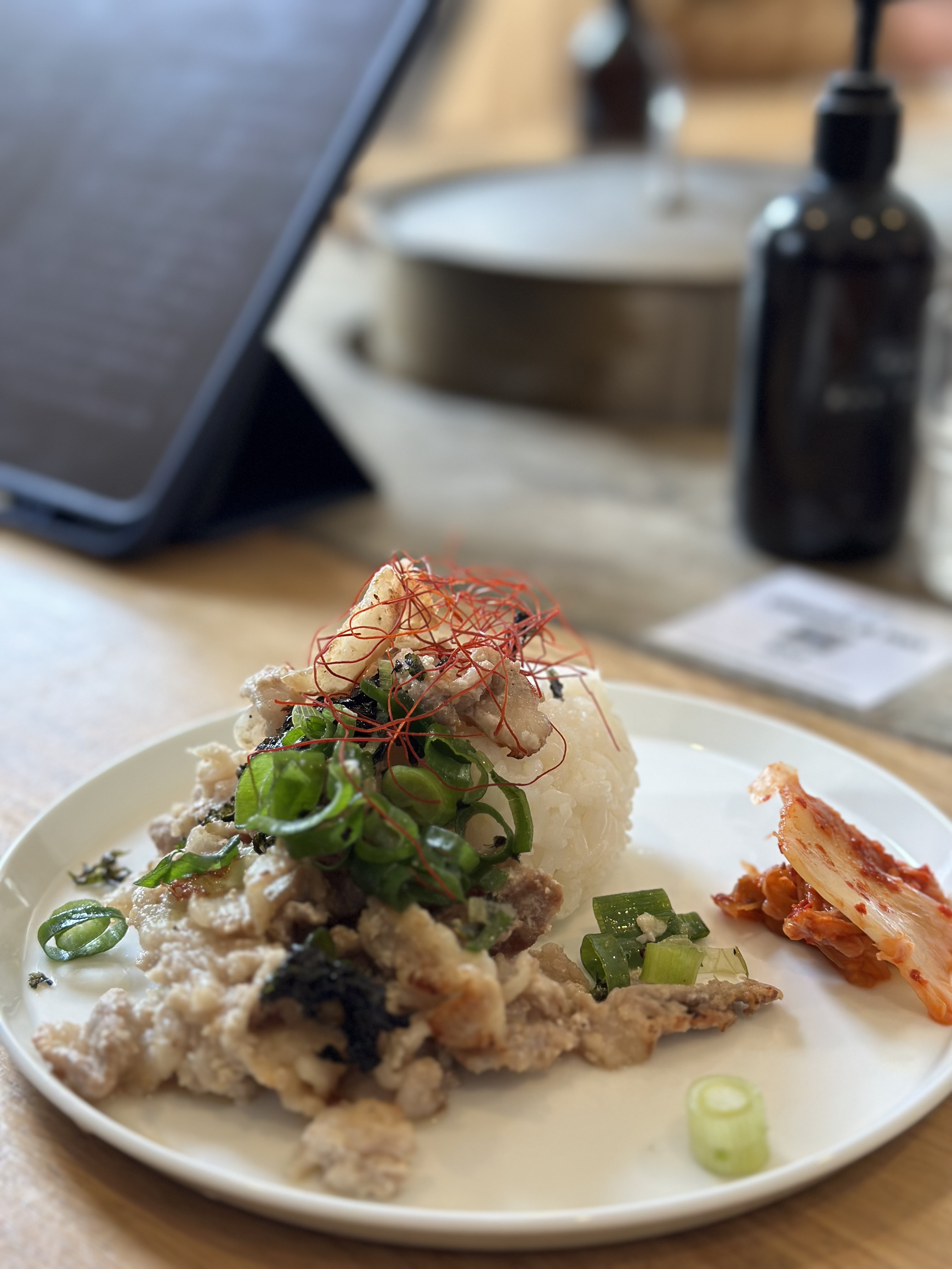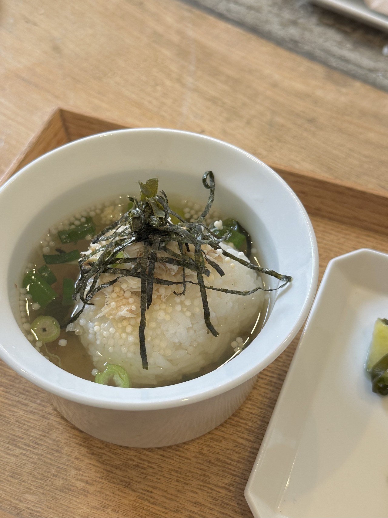 그리고 나온 내 메뉴 '오니기리' 심심하게 간을 한 오니기리에 얇은 돼지고기를 볶아 얹어 냈다. 신기하게 김치가 사이드에 조금 나왔는데 자리하고 있는 김치가 괜히 자랑스럽게 느껴졌다. 자극적이고 간이 센 음식들을 주로 접하는 요즘이었는데, 이 오니기리는 너무나 맛있게 먹었다. 적당히 간이 된 얇은 돼지고기, 밥, 가니쉬로 얹어진 파와 실고추까지. 화룡정점은 김치. 대한민국 만세! 각 재료의 조화도 너무 좋았다. 다음에 와서는 다른 오니기리를 시켜 먹고 싶단 생각이 절로 들었다.