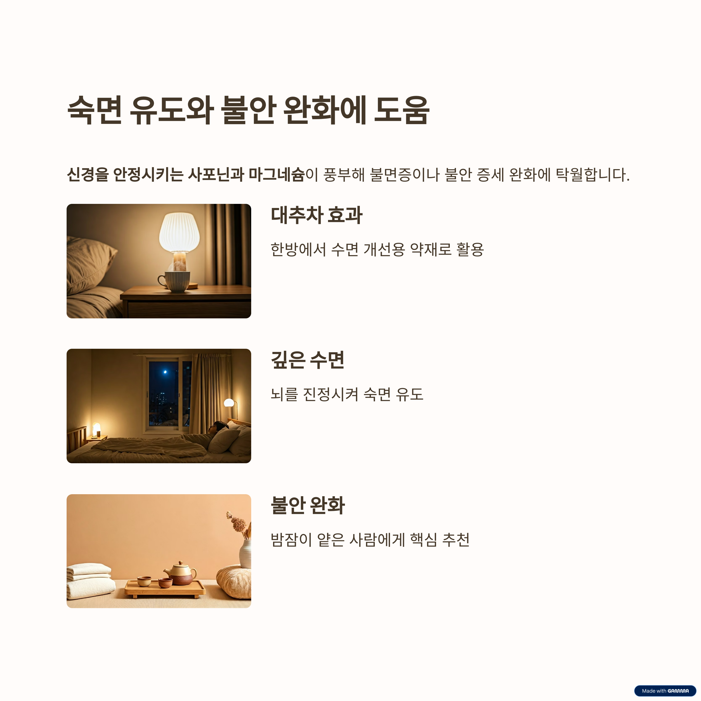 | 수면 개선 | 진정 작용 및 신경 안정 효과 |