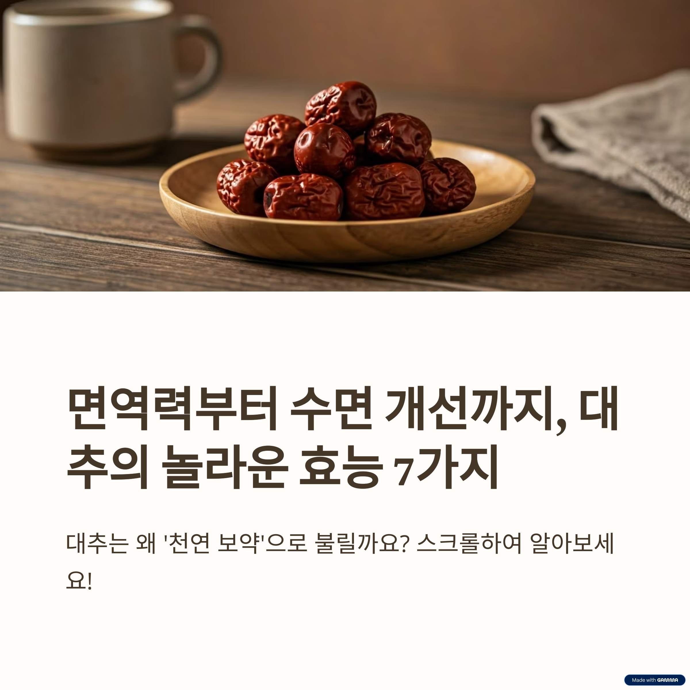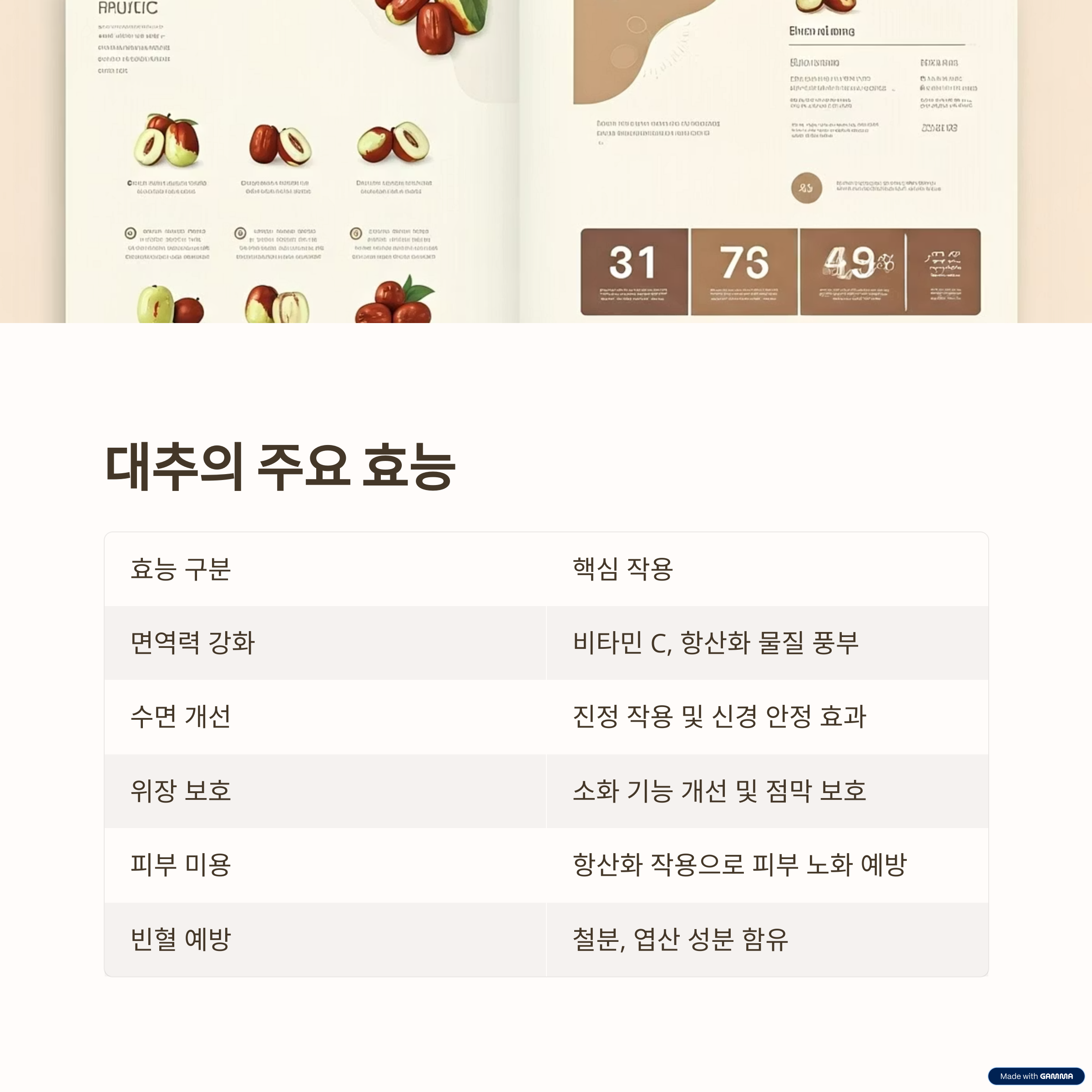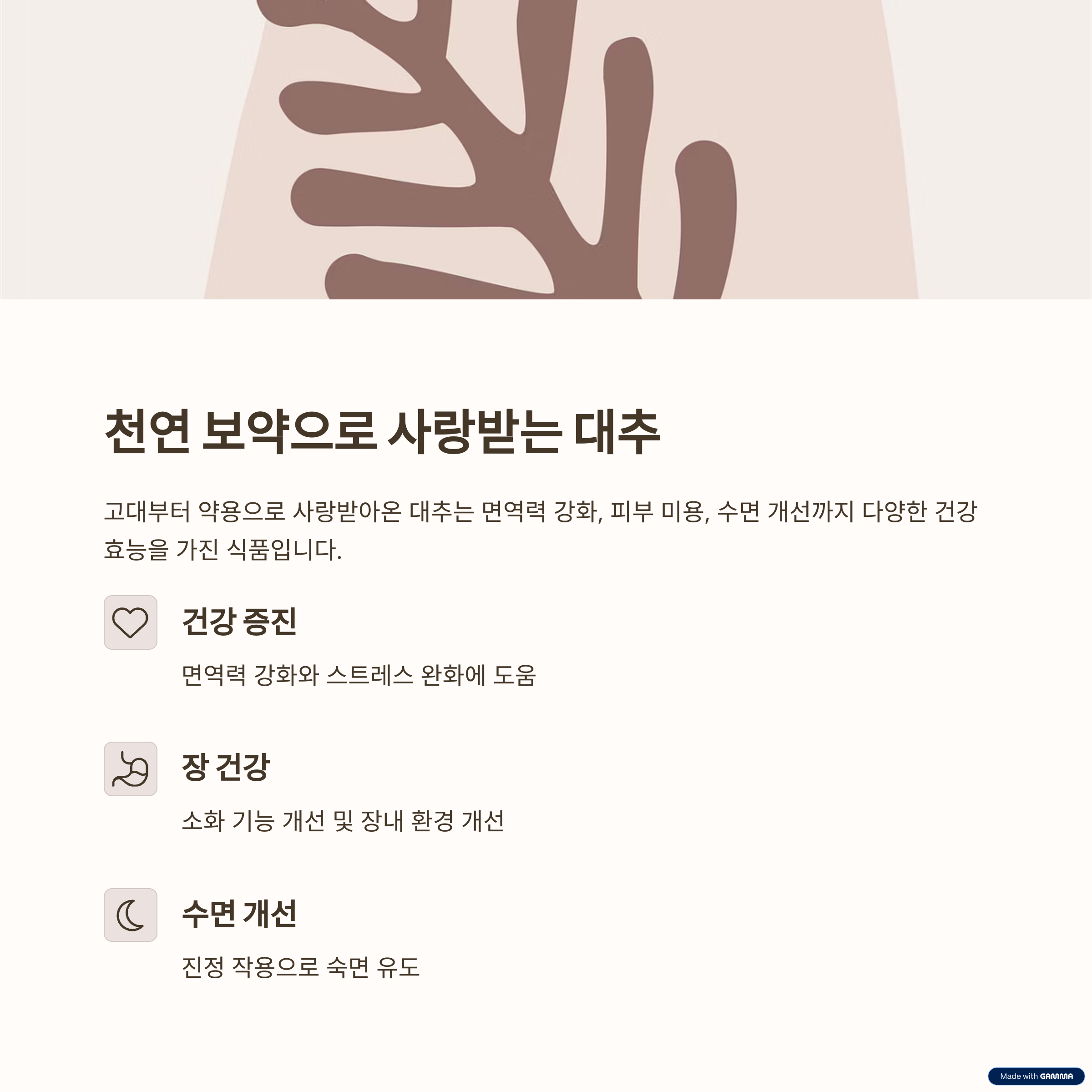 대추는 고대부터 약용으로 사랑받아온 과일로, 면역력 강화부터 피부 미용, 수면 개선까지 다양한 건강 효능을 가지고 있습니다.