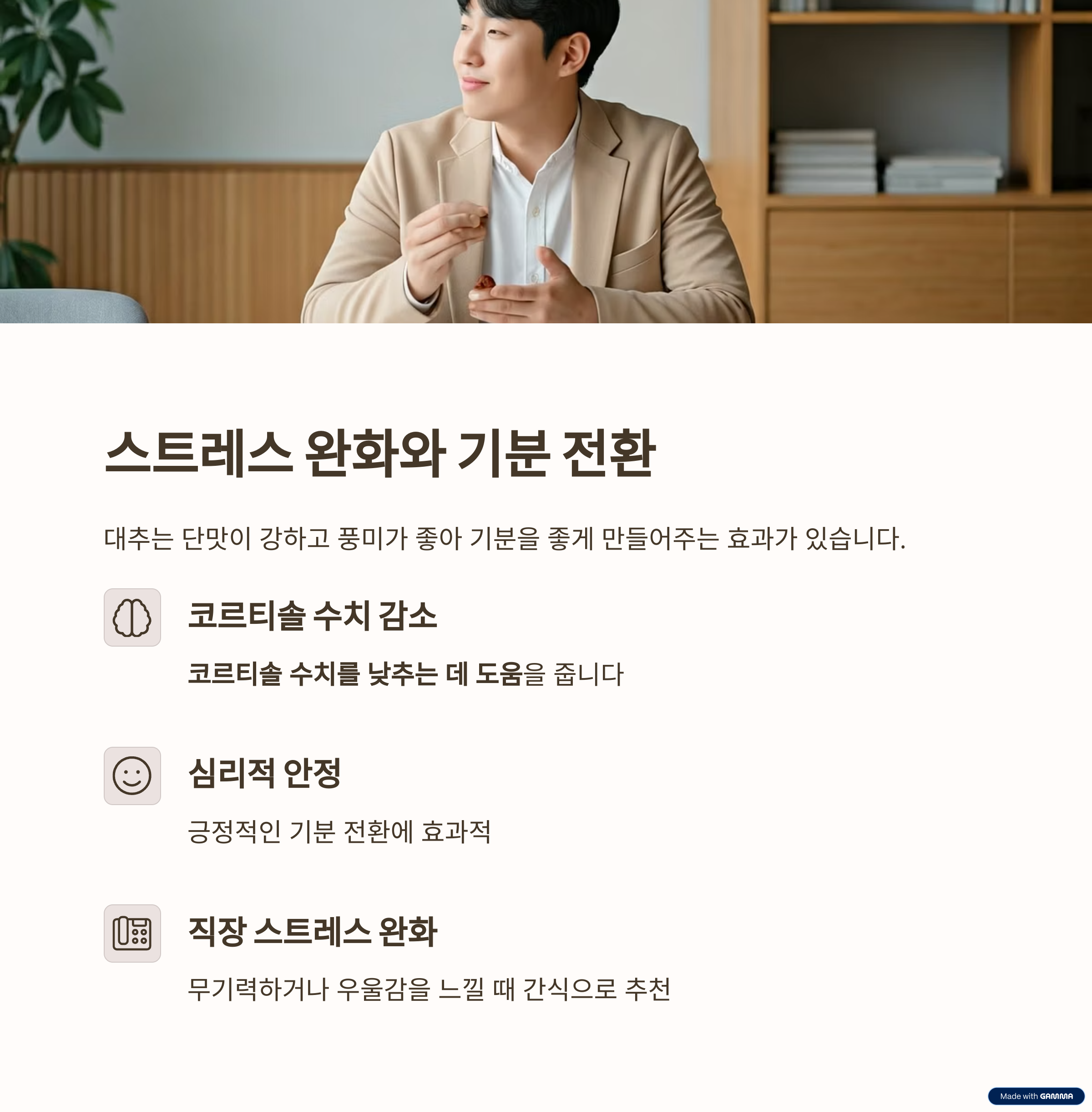 직장 스트레스로 무기력하거나 우울감을 느낀다면 간식으로 섭취해보는 것도 좋습니다.
