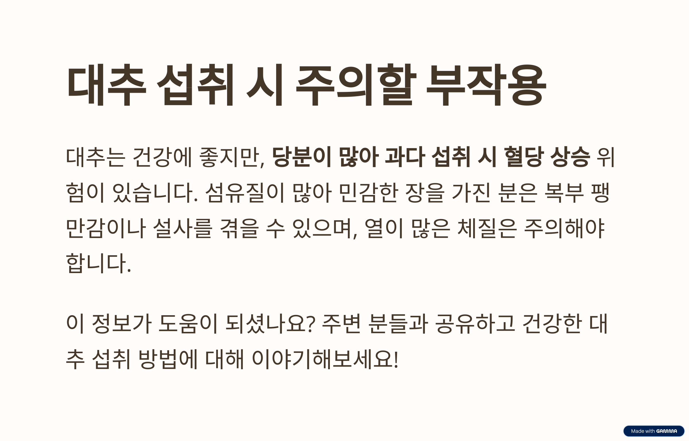 대추는 건강식품이지만 당분이 많아 과다 섭취 시 혈당 상승 위험이 있습니다.