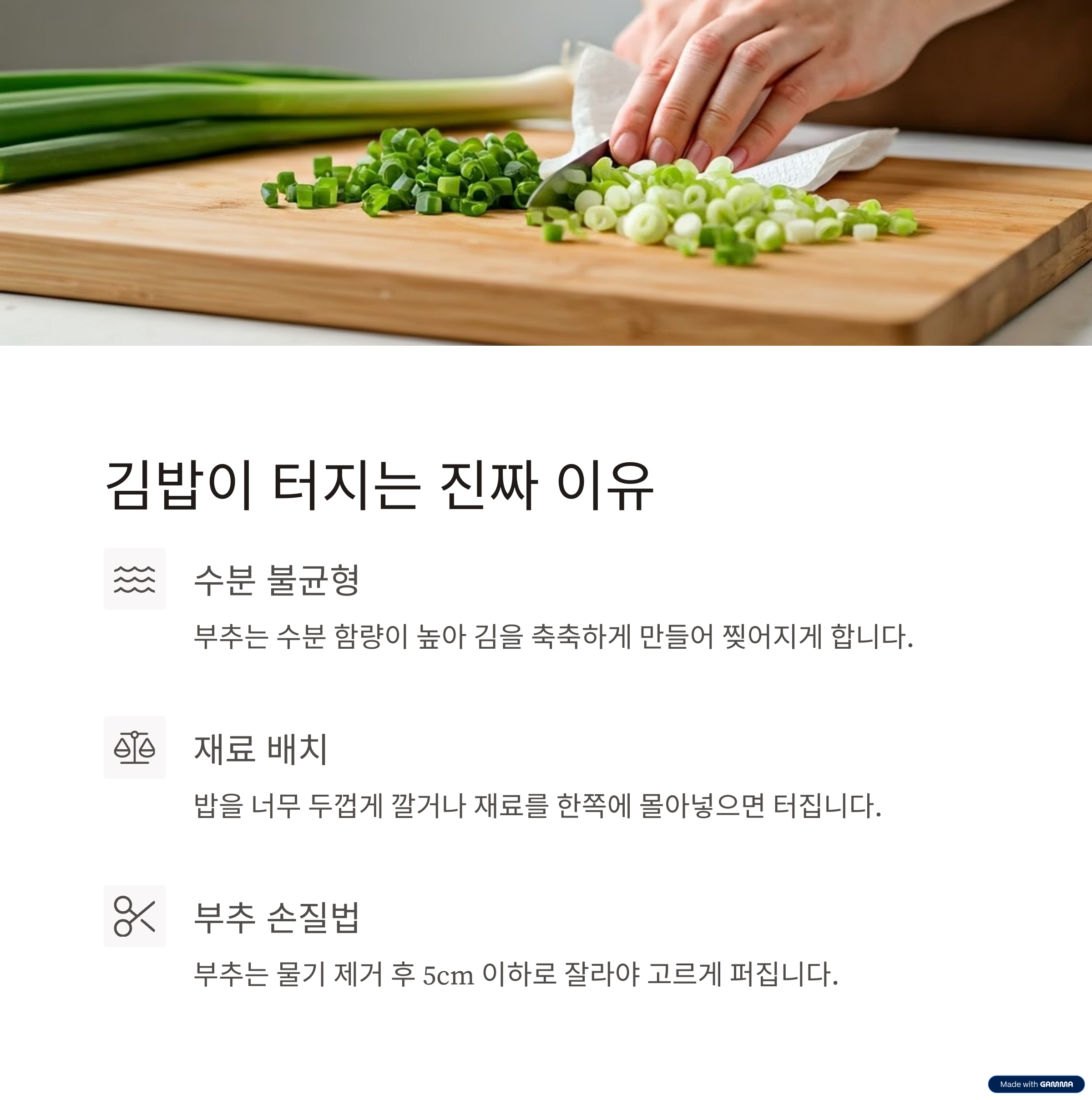 실제로 터지는 원인은 주로 재료와 밥의 수분 불균형, 잘못된 말기 순서 때문입니다.