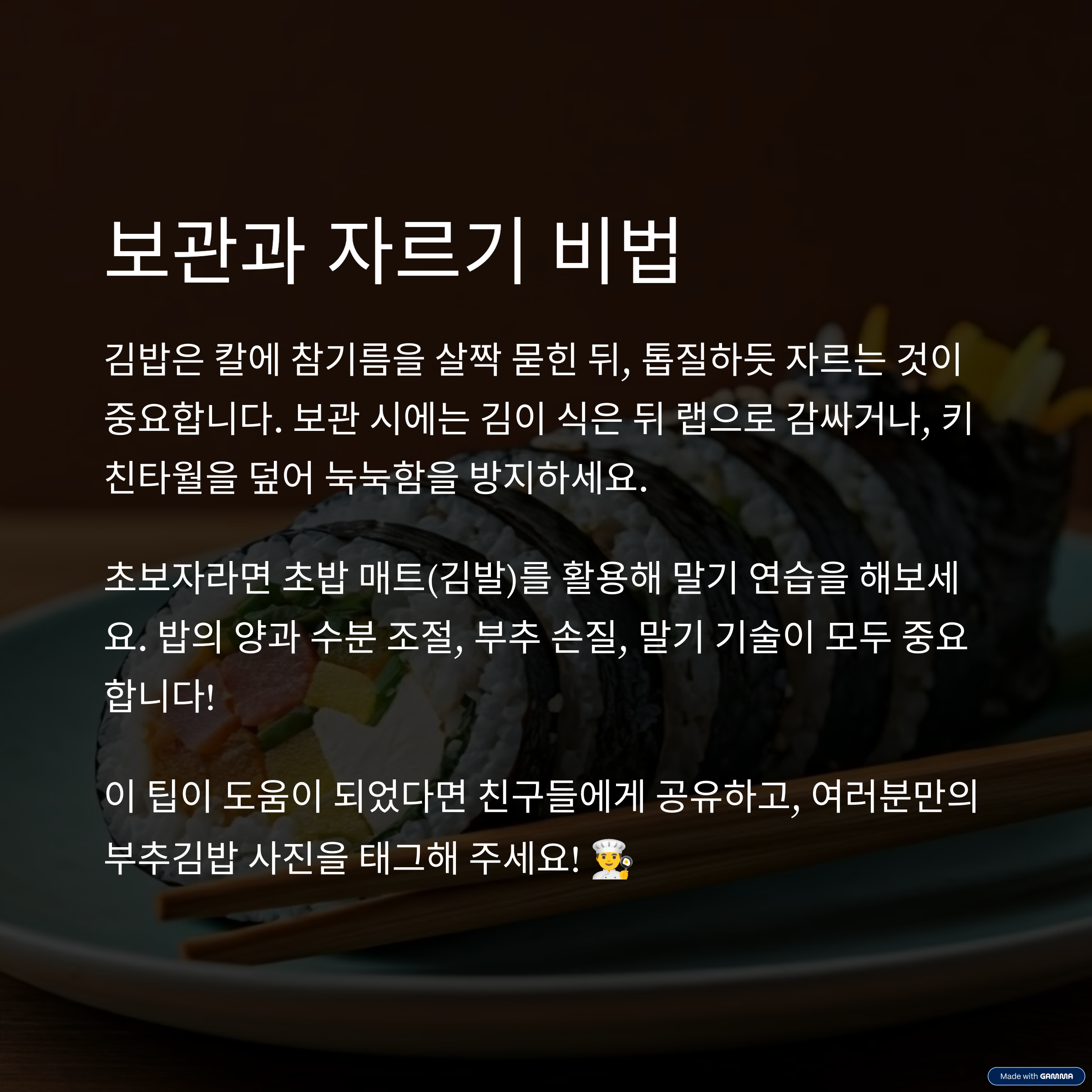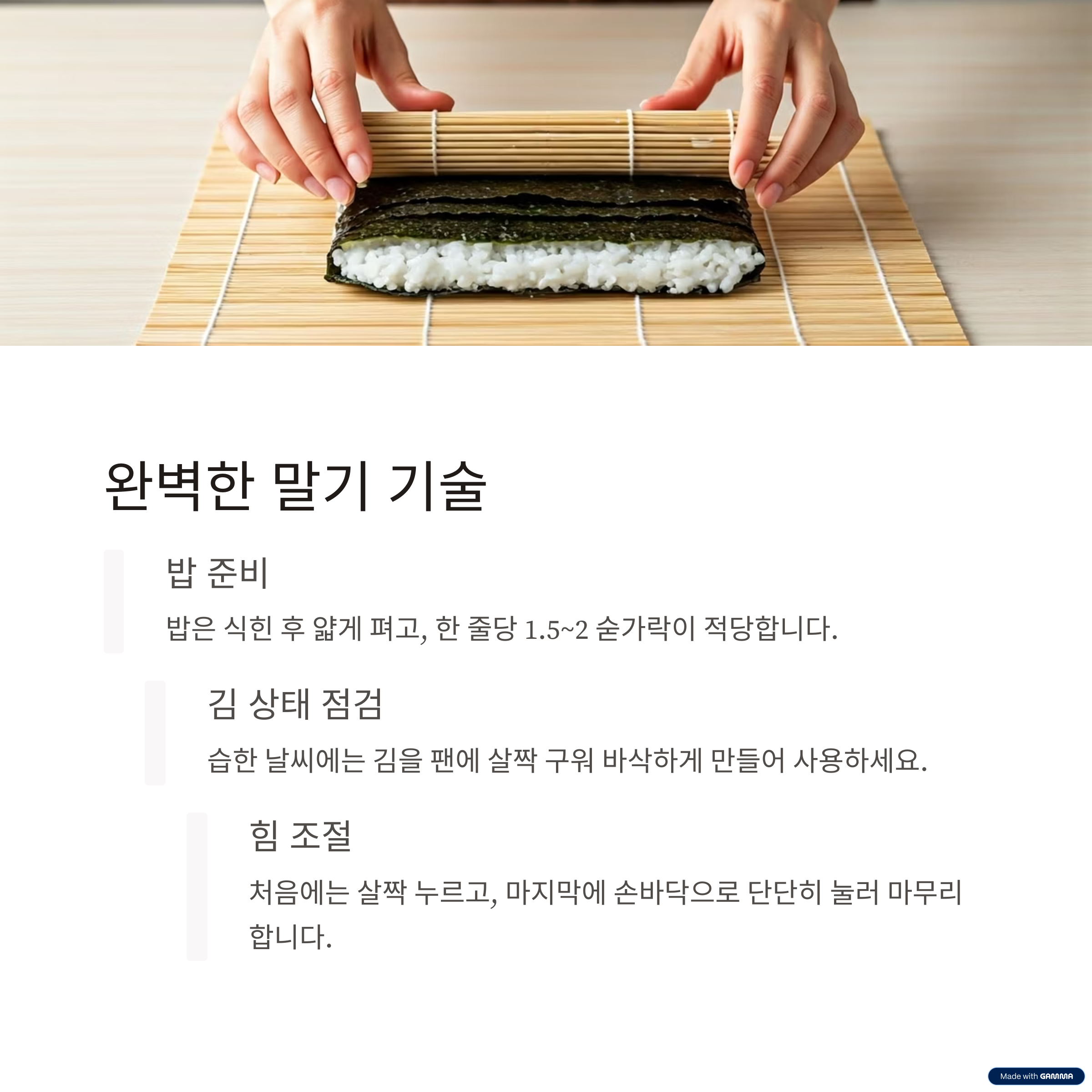 또한, 초보자라면 김 대신 시트지를 이용해 연습한 뒤 실제 김으로 옮겨 말면 성공률이 높아집니다.