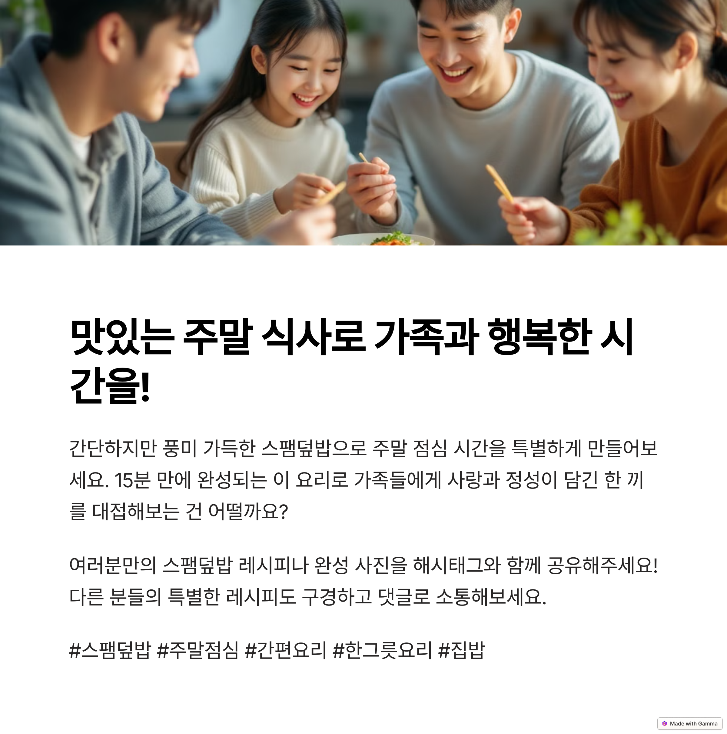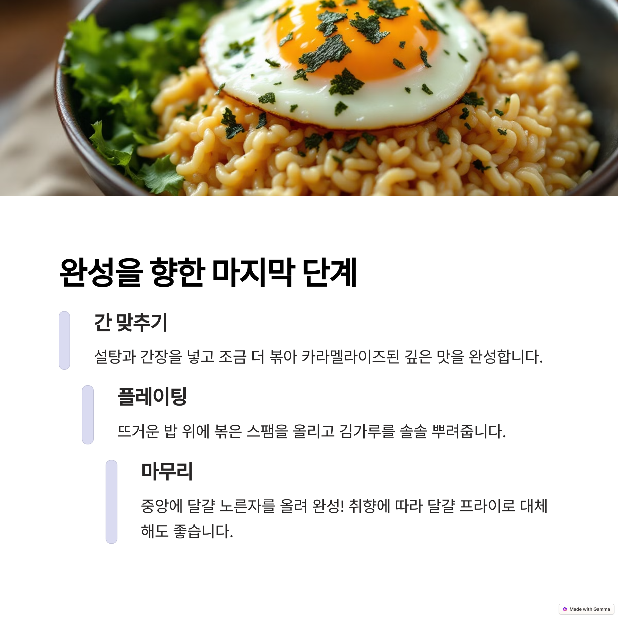 오늘 소개된 스팸덮밥 레시피로 빠르고 맛있는 한 끼를 준비해보세요.