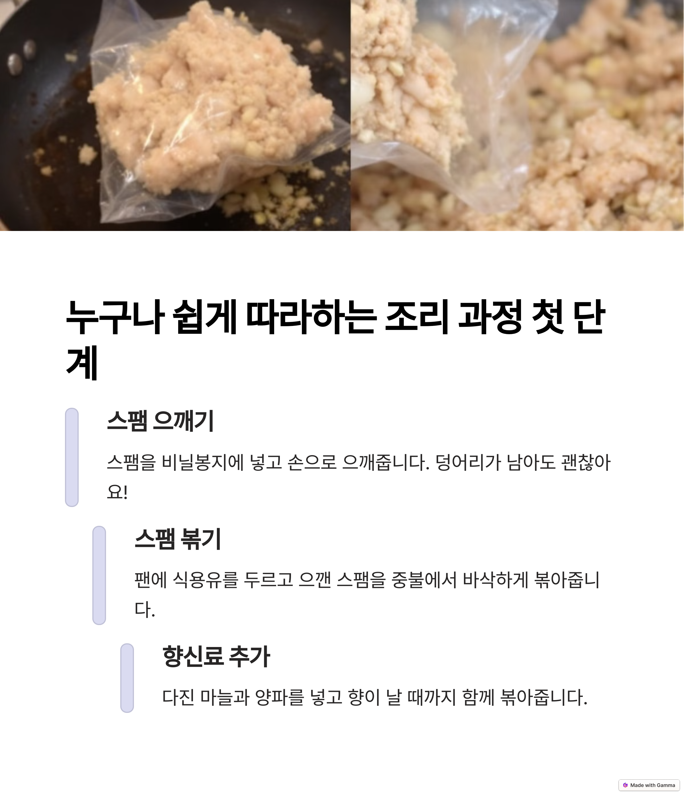 준비 과정에서 스팸을 으깨 꼬들꼬들하게 볶으면 잡내는 없어지고 더 맛있는 결과물을 얻을 수 있습니다.
