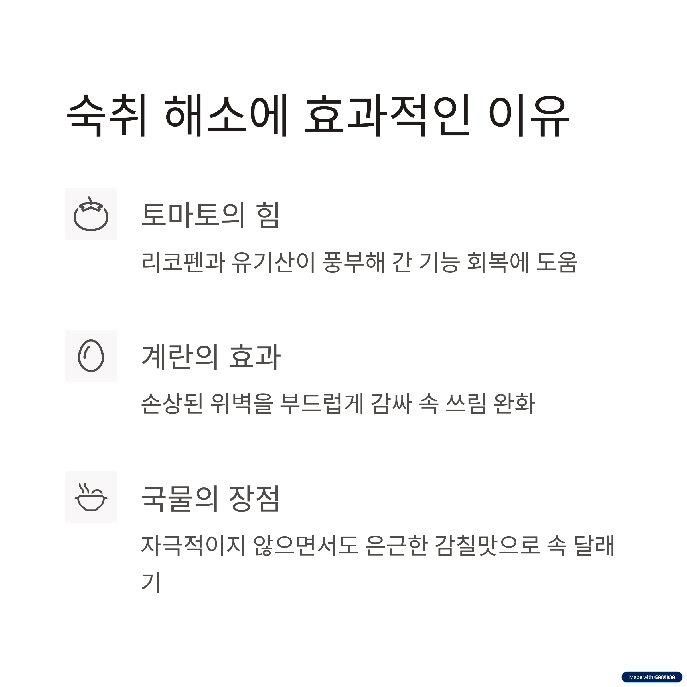 "자극적이지 않으면서도 은근한 감칠맛이 살아있어 부담 없이 속을 달랠 수 있습니다."