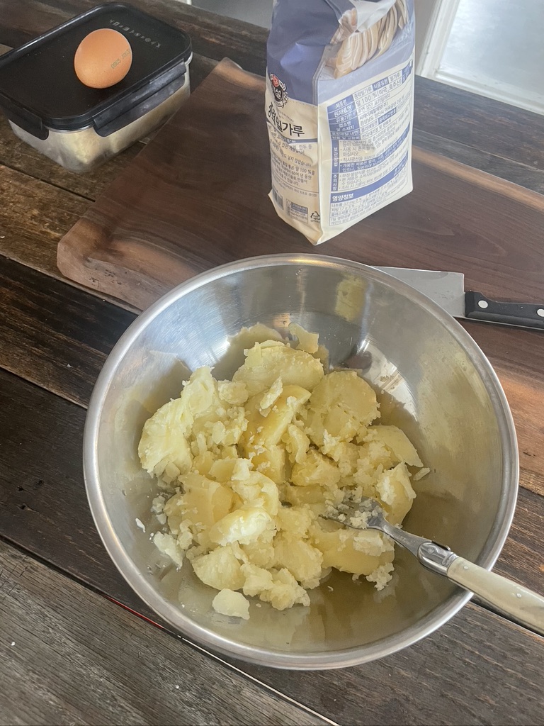 감자가 다 익으면 껍데기를 깐뒤 포크로 으깬다. 껍데기를 깔때 뜨거우니 마른 타월에 얹어 데이지 않게 조심하자.