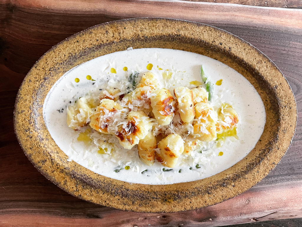 접시에 소스를 깔고 그위에 구워둔 뇨끼를 얹어 말던솔트, 파마산, 트러플 오일로 마무리한다.