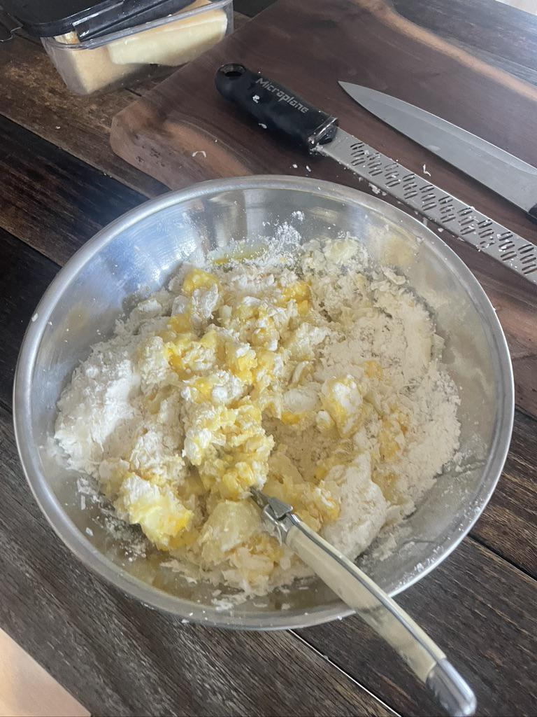 밀가루, 파마산 치즈 200g, 달걀 전란 1ea, 달걀 노른자 1ea를 넣고 반죽을 한다. 밀가루를 넣어가면서 손에 들러 붙지 않을 질감까지 반죽한다.