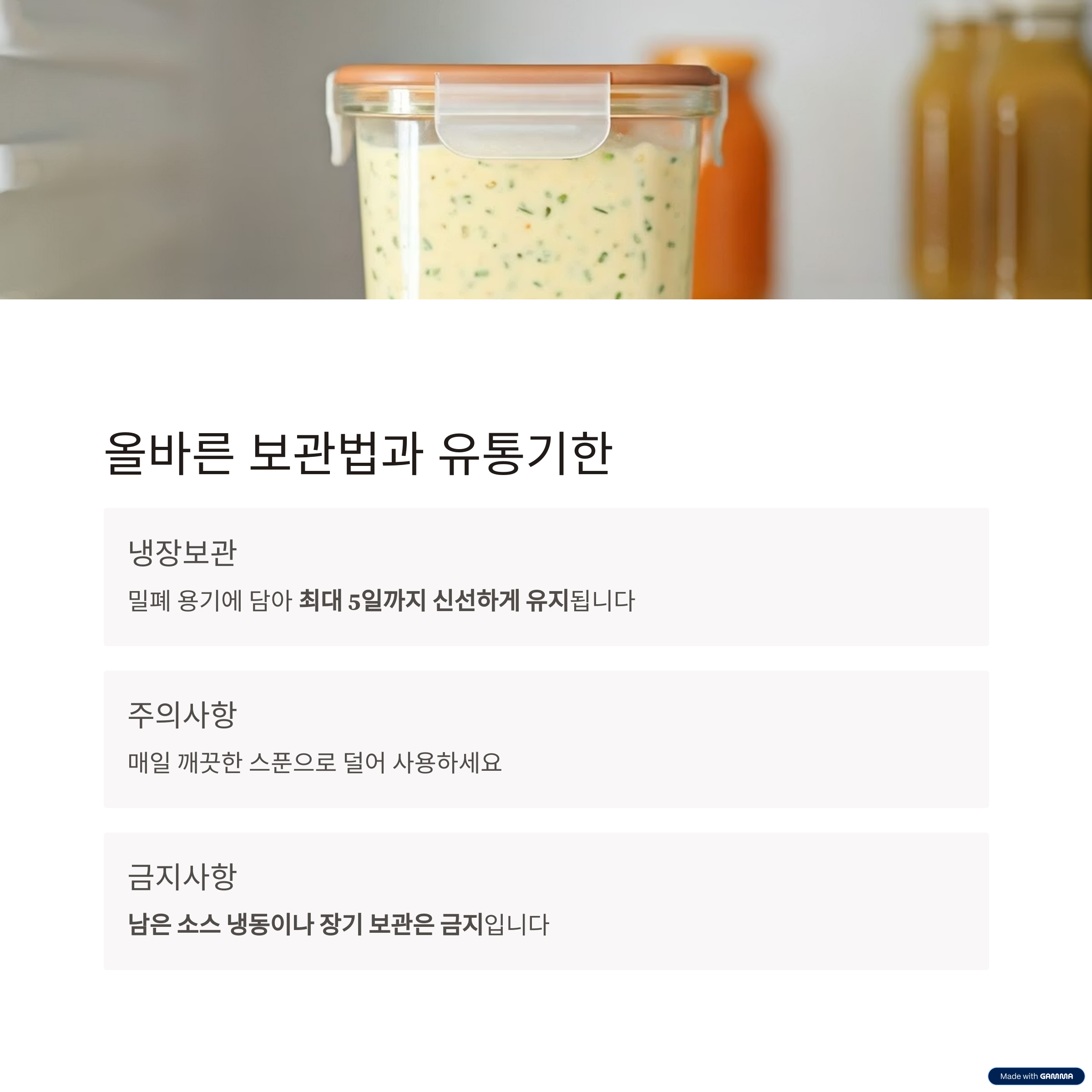 | 밀폐 용기 냉장보관 | 3~5일 | 매일 깨끗한 스푼 사용 |