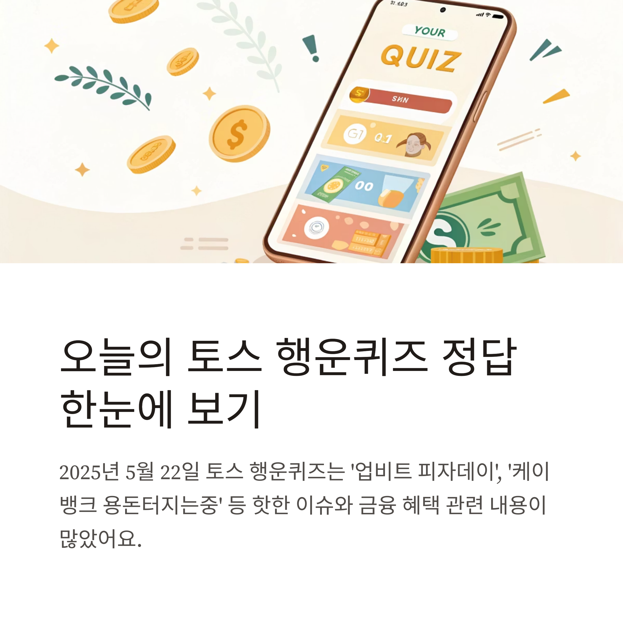 2025년 5월 22일 토스 행운퀴즈는 다양한 이벤트와 브랜드와 연계된 문제들이 출제되었습니다. 오늘 퀴즈는 ‘업비트 피자데이’, ‘케이뱅크 용돈터지는중’ 등 핫한 이슈와 금융 혜택 관련 내용이 많았어요. 아래에서 오늘의 주요 정답과 참여 팁을 확인해보세요! 🎯